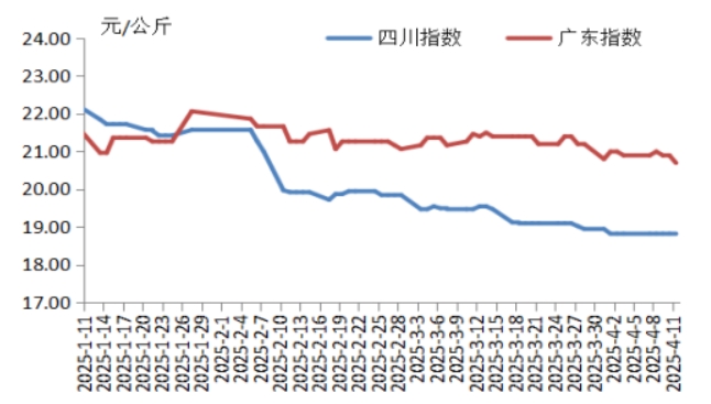 本周,四川地區(qū)豬肉周均價(jià)為每公斤18.83元,環(huán)比下跌0.2%,同比下跌1.8%,較上周漲幅收窄0.4個(gè)百分點(diǎn)。本地區(qū)散養(yǎng)戶出欄節(jié)奏較為平穩(wěn),豬肉供應(yīng)穩(wěn)定。清明假期結(jié)束后,豬肉消費(fèi)疲軟,周均價(jià)微跌。