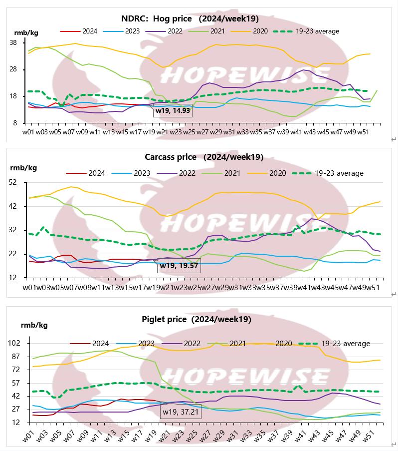 Live pig price of week 19 in 2024 was RMB14.93/kg, with an increase of 0.57% compared with last week and up 3.11% compared with the same term of last year. The carcass price is RMB19.57/kg, with an increase of 0.75% compared with last week and up 6.62% compared with last year. At the beginning of the Labor holiday, some farms took time off, leading to reduced market supply and increased price for live pigs at the production end. Live pig price rebounded to over RMB15/kg. After Labor holiday ended, market supply increased with weak demand, live pig price fell below RMB15/kg. As we know, the slaughterhouses operating rate for this week was close to 28% with a decline of 21% compared with week 18 and down 3.76% compared with the same term of last year.