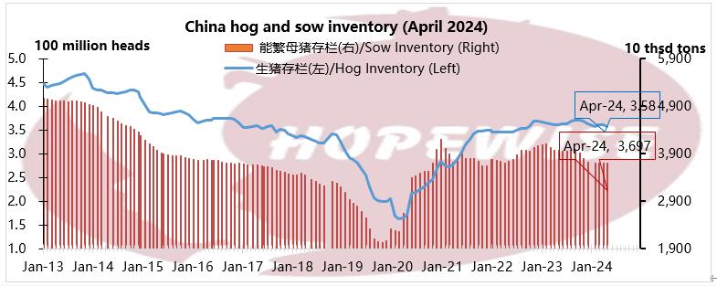 The inventory of hog in April was 358 million heads, with down 0.7% compared with last month and down 0.8% compared with the same term of last year. The sow inventory in April was 36.97 million heads, with down 0.08% compared with last year and down 7.02% compared with the same term of last year.