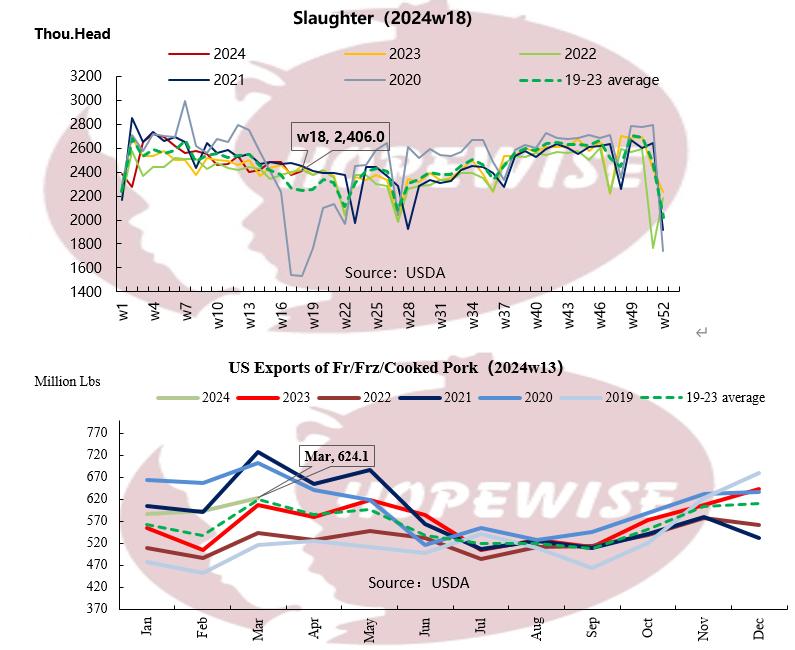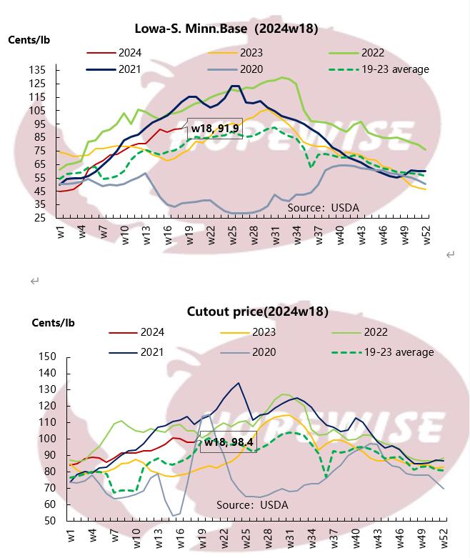The US live pig price of last week was USD91.86/cwt, with up 0.96% compared with the week 17 and up 26.16% compared with the same term of last year. The cutout price of last week was USD98.35/cwt, with up 0.15% compared with the week 17 and up 21.54% compared with the same term of last year.