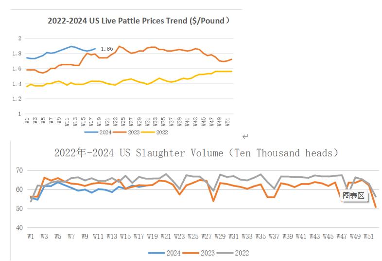 In the week of May 4, the live cattle prices stood at $1.86 per pound and slaughter volume reached 619 thousand heads, a slight increase of 0.98% compared to last week.